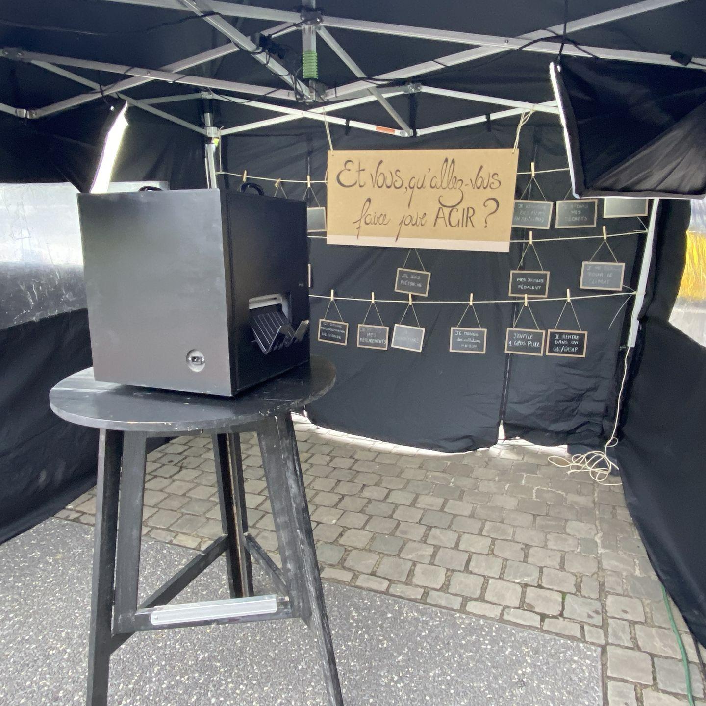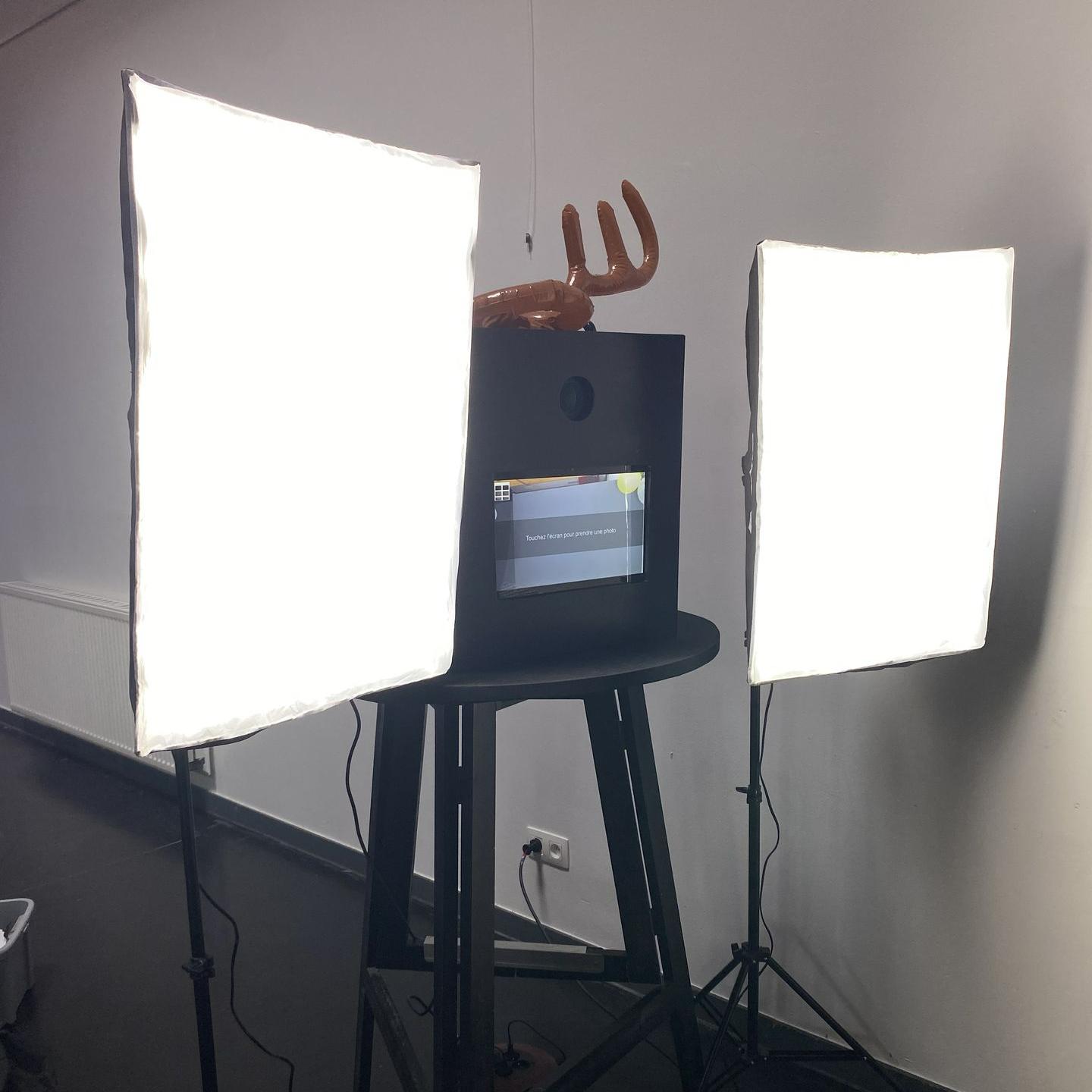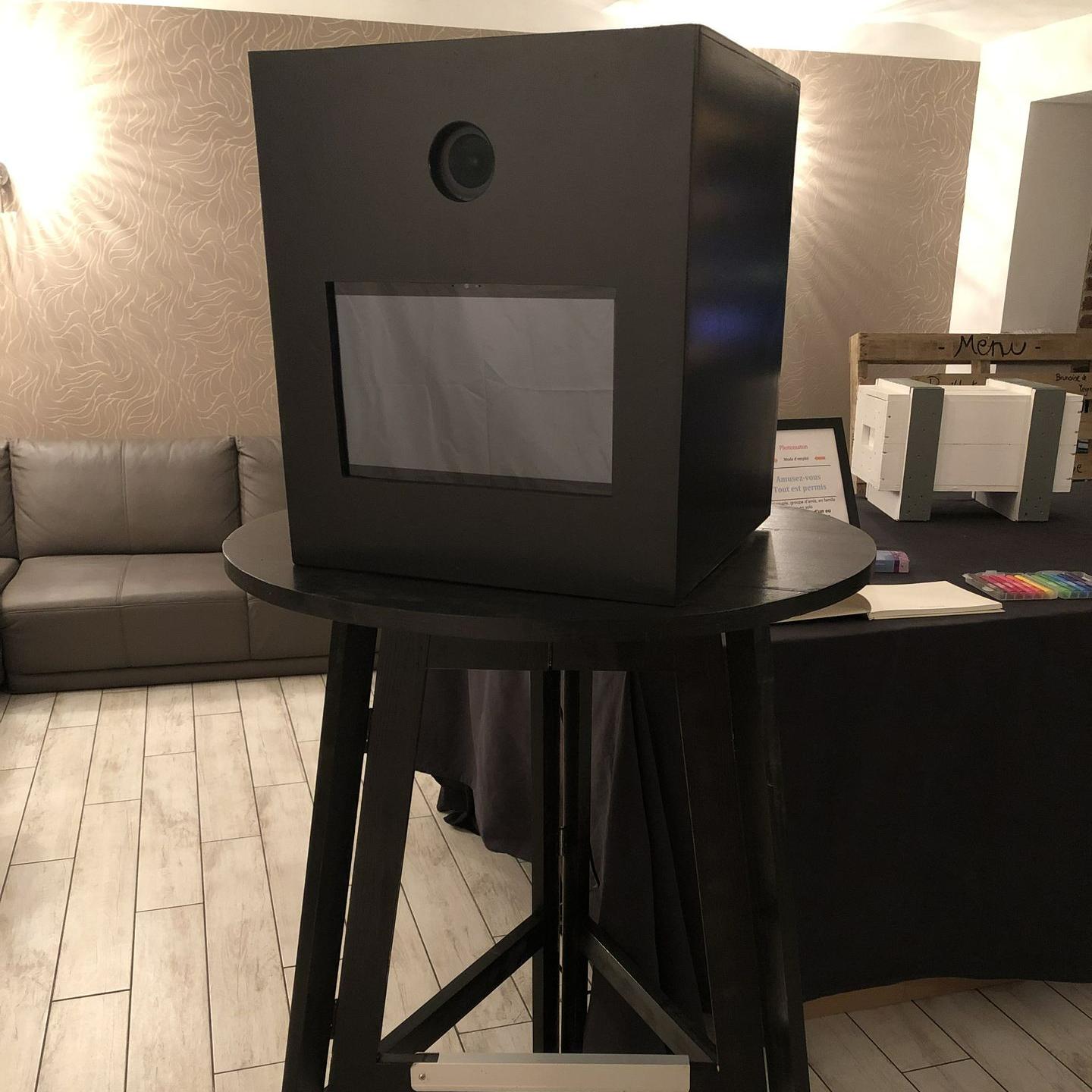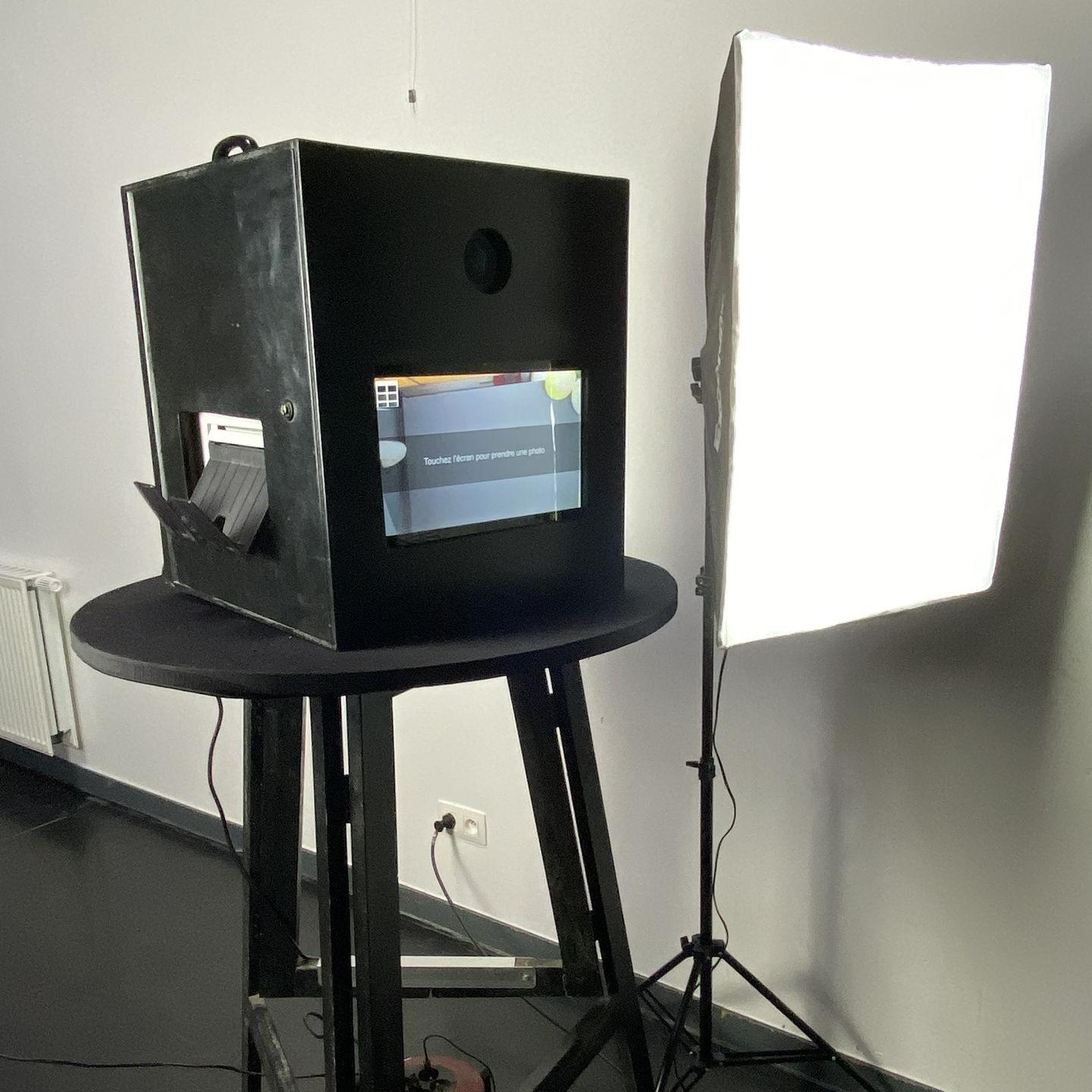 - Boîte carrée noire “tout en un” avec écran, appareil photo NIKON et imprimante PRO